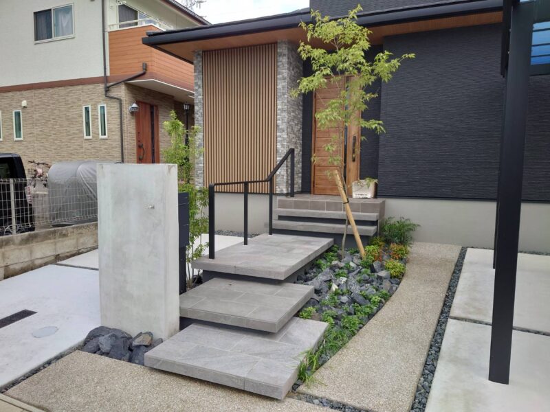こだわりポイント: 表面に凹凸のある「割肌」風のタイルを使用。光の当たり方によって表情が変わり、雨の日でも滑りにくいという機能性も兼ね備えています。植栽の緑との相性が非常に良く、自然豊かな雰囲気の外構に馴染みます。