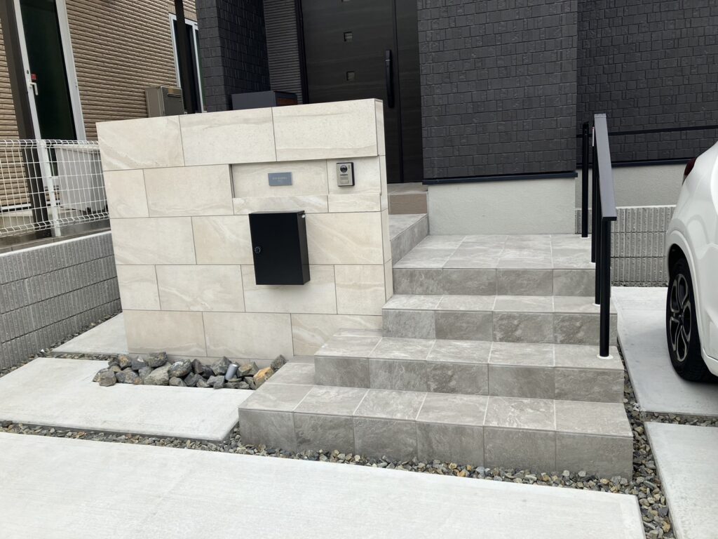こだわりポイント: 建物本体のサッシや外壁の色味と完璧に調和するよう、タイルの色調を緻密に計算しています。エッジを際立たせる施工技術により、シャープで都会的な印象を与えます。シンプルだからこそ、職人の腕の良さが光る事例です。