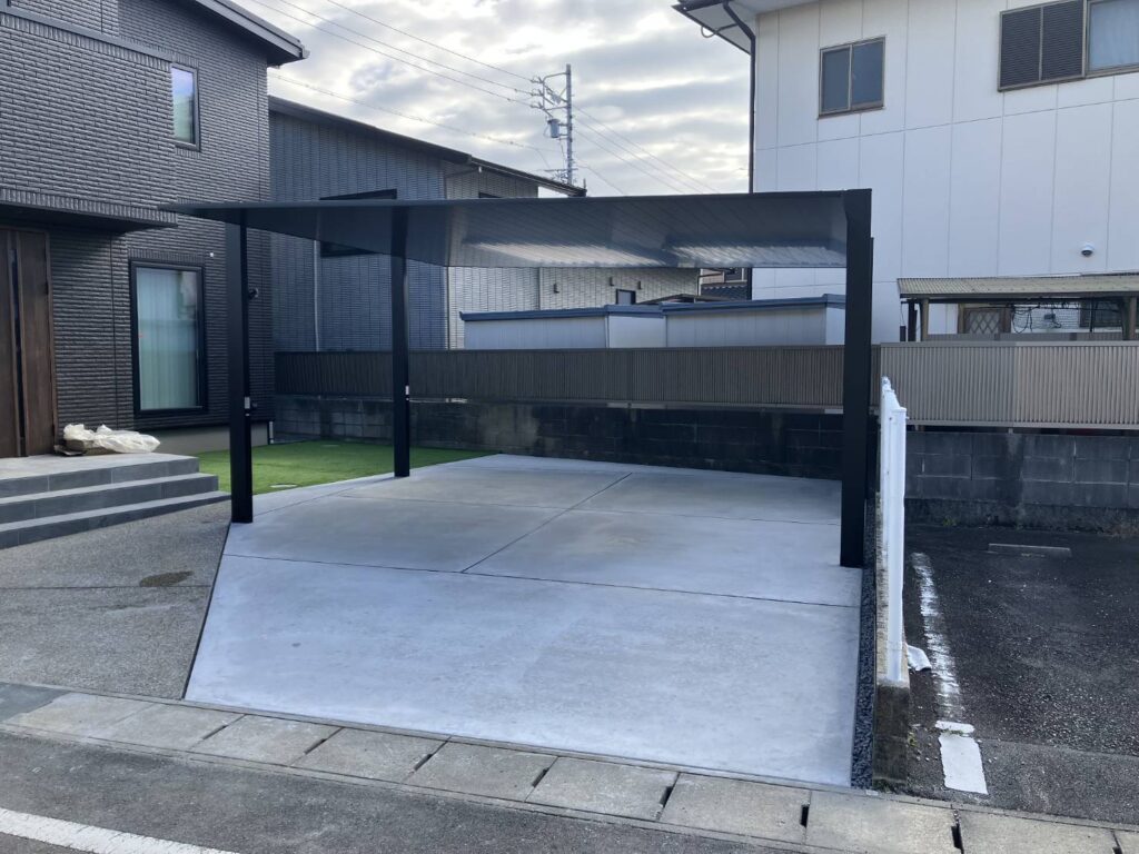 特徴: こちらもフラットなポリカ屋根ですが、**「2台用+α」**の広々としたスペースが特徴です。車の横に自転車を置いたり、雨の日の乗り降りをスムーズにする余裕があります。