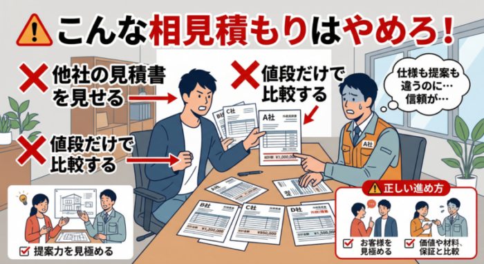 「数社から見積もりを取る」こと自体は正解ですが、以下の2点はトラブルの元です。