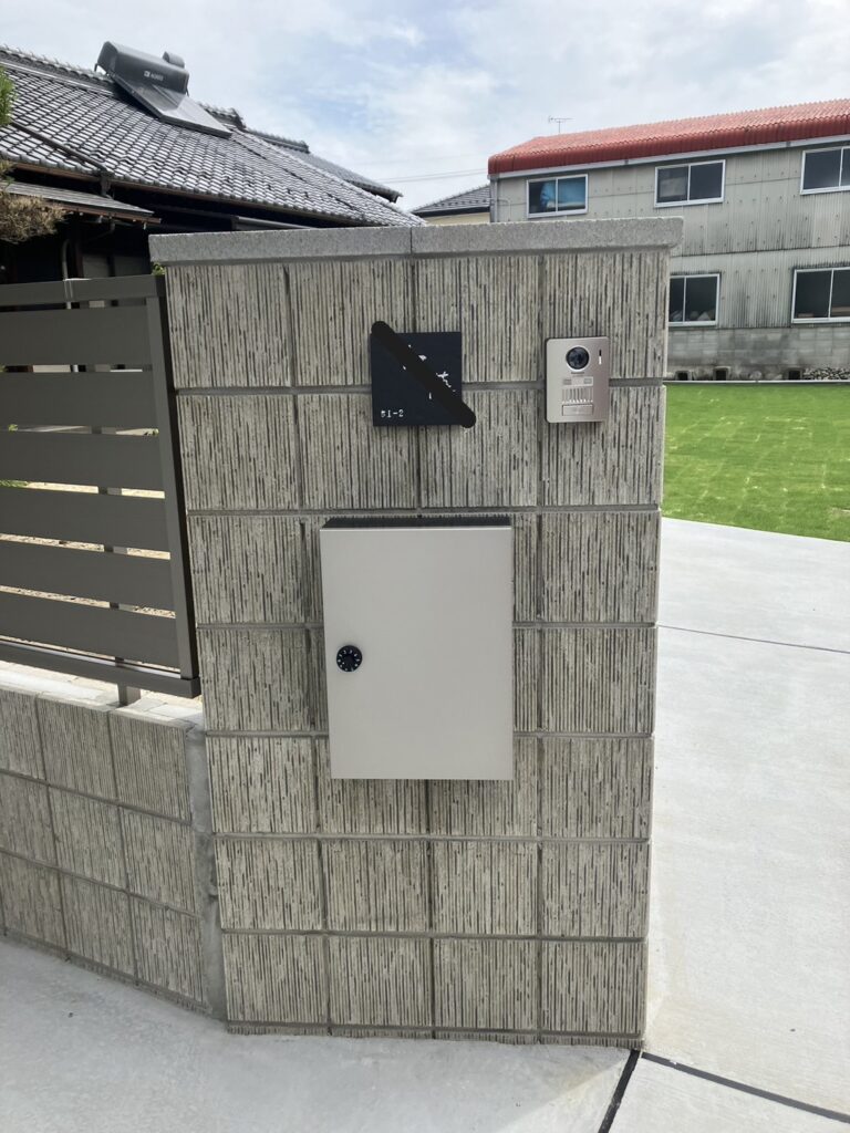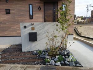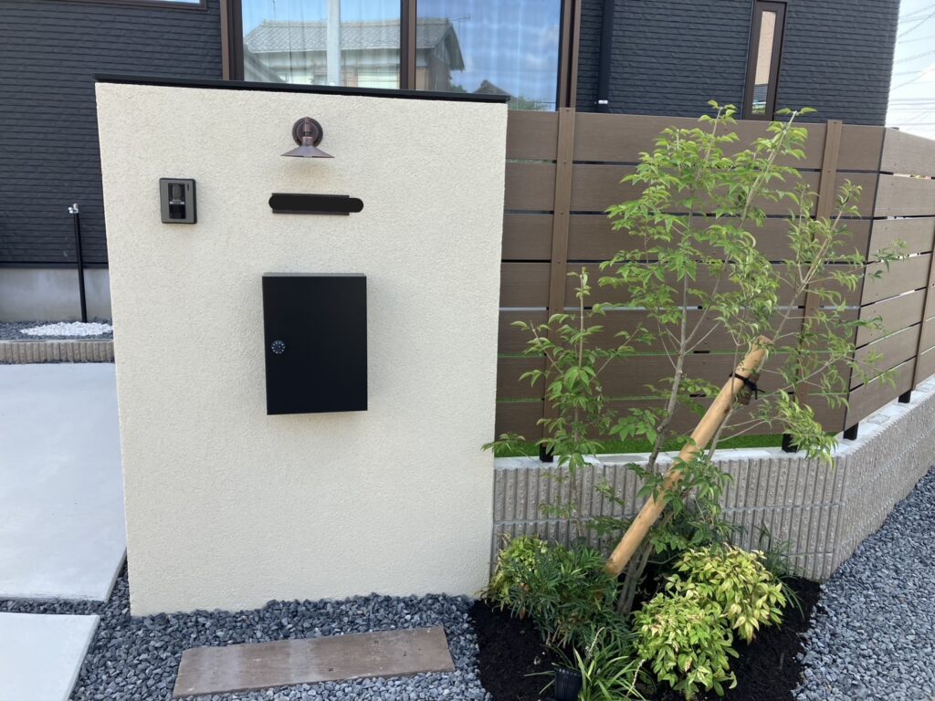 こだわり: 門柱をあえてダークトーンにすることで、**空間全体がギュッと引き締まります。**宅配ボックスや照明のゴールド・真鍮色が美しく映えるのも、この色の魅力。夜間のライトアップも非常に美しく決まる仕上げです。