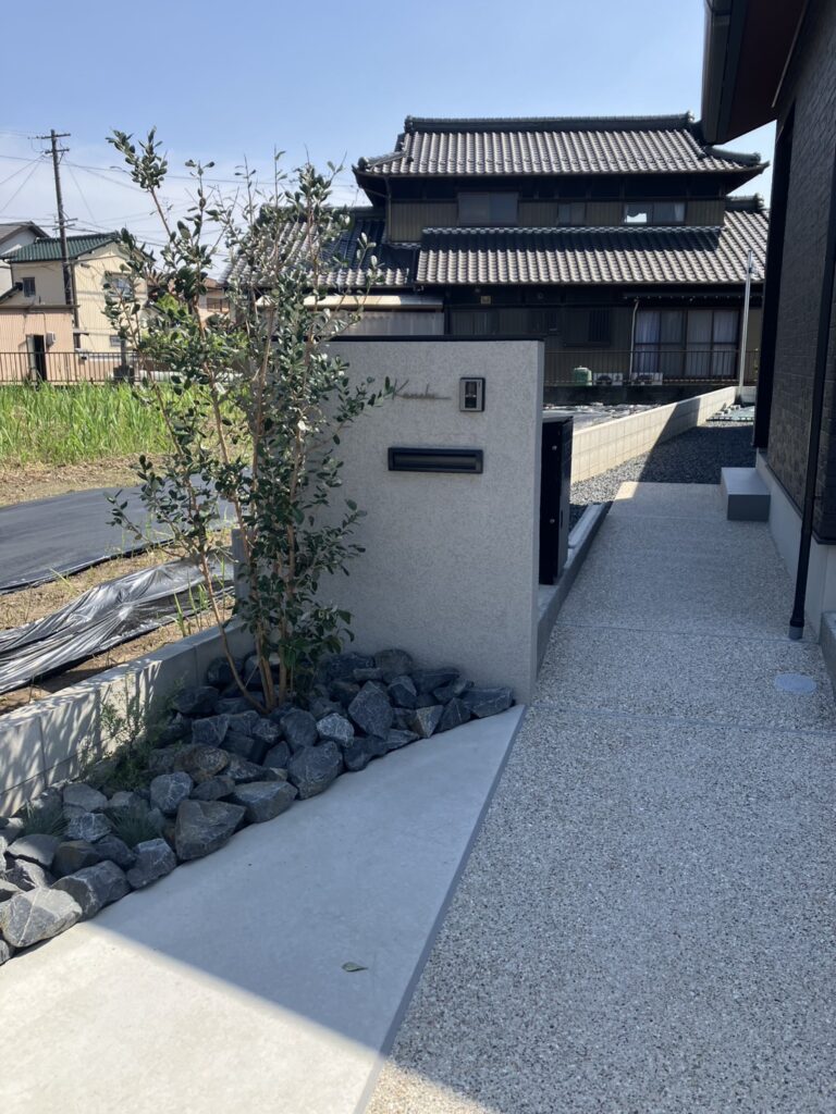 こだわり: モルタルよりもひび割れしにくく、耐久性が高いのがメリット。この事例では、柔らかな表情を出しつつ、落ち着いたトーンで建物との一体感を持たせています。温かみとモダンさを両立させたい方におすすめです。