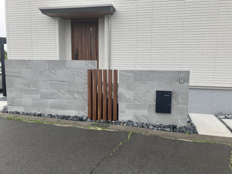 今回の主役は、圧倒的な存在感を放つ**「600×300角の大判タイル」**を使用した門柱です。建物全体のトーンに合わせつつ、素材の質感を活かしたデザインで、住まいの顔をより美しく引き立てました。