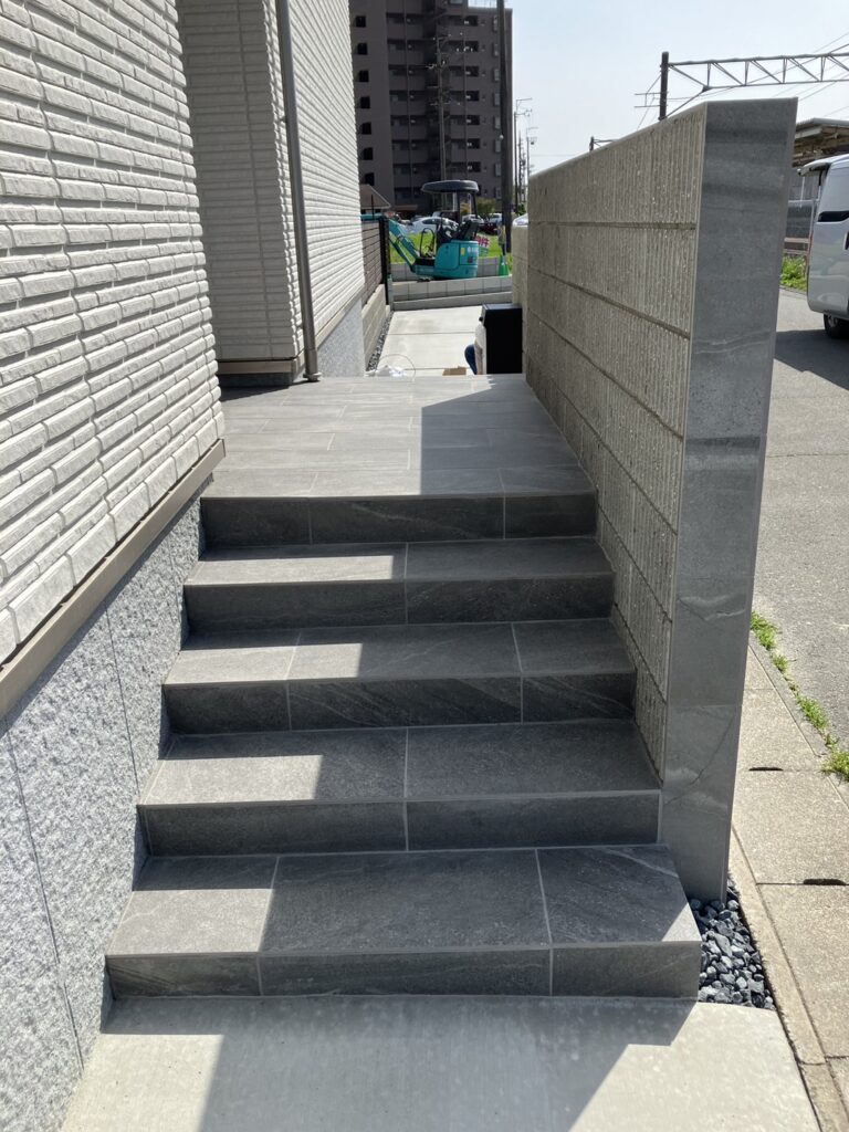 門柱と同じテイストのタイルで仕上げた階段。蹴込み(けこみ)部分を意識した設計で、高級感のある足元を演出しています。