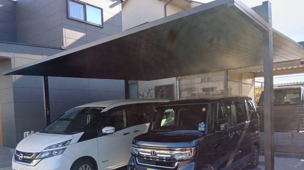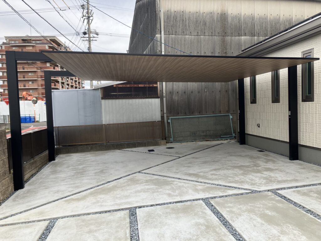 【施工事例】小牧市|力強さと美しさが共鳴する。折板カーポート「SW」と大判タイルの門柱が映える家
