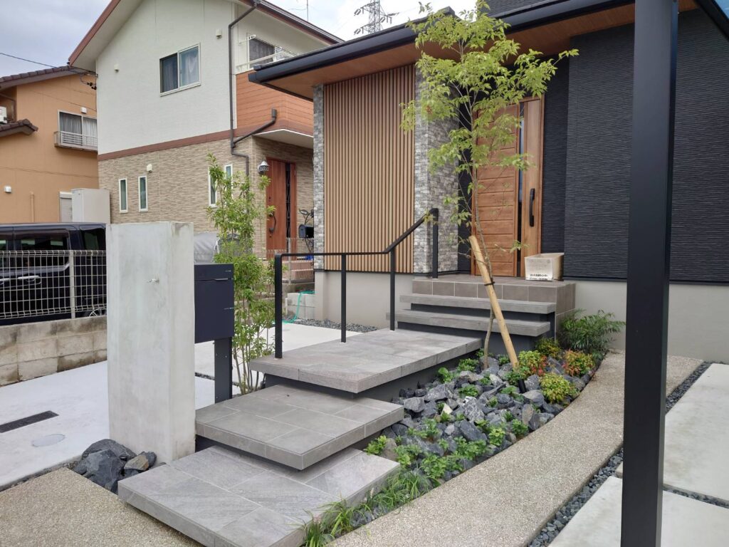 【小牧市】浮き階段とシンボルツリーが映える、素材感を活かしたモダンエクステリア